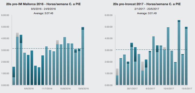 – Finalmente, presento como entrenamos y os muestro la comparativa de entrenamientos entre las 20 semanas previas al IM Mallorca (10h46’) y las 20 previas al Ironcat (9h48’). En este último periodo de entrenamiento estuvo menos horas comparado con la preparación para Mallorca (1h menos de media a la semana), pero mejoró en todos los segmentos. Seguramente también su eficiencia metabólica, aunque no lo comprobamos. En la siguiente tabla queda bastante resumido: