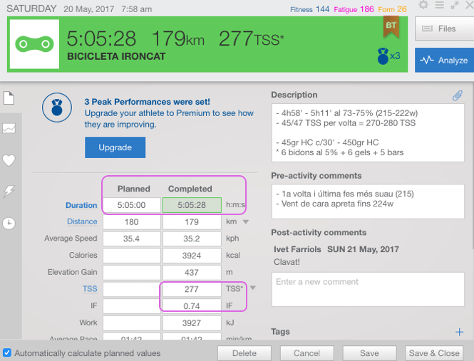 En la siguiente imagen se observa un segmento ciclista completado tal y como se había planeado: 270-280 TSS para los 180km al 73-75% (gracias a la tabla) y entre 4h48’ y 5h11’ (mediante “Best Bike Split” , previsión de Viento “Wind Gurú” y un test de CdA)