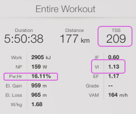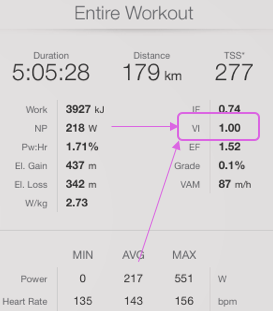 2. El VI es un indicador de la variabilidad de potencia de un ciclista o triatleta durante un entrenamiento o competición en concreto (Coggan, A.). Es el ratio de la potencia normalizada (NP) con la potencia media (Avg), donde un valor 1 significará que la fuerza aplicada es uniforme. Es por ello que tomando como ejemplo un triatleta que ha realizado un segmento de ciclismo con un VI cercano a 1.00, si lo ha hecho con una cadencia entre 80-90rpm y un IF de 75%, supondrá una utilización uniforme del tipo de fibras musculares, en este caso lentas, y por tanto se utilizan los lípidos como sustrato energético más que el glucógeno, retrasando así el agotamiento de las reservas hepáticas o musculares, cosa que le beneficiará posteriormente el segmento de carrera a pie (Howe, C.).