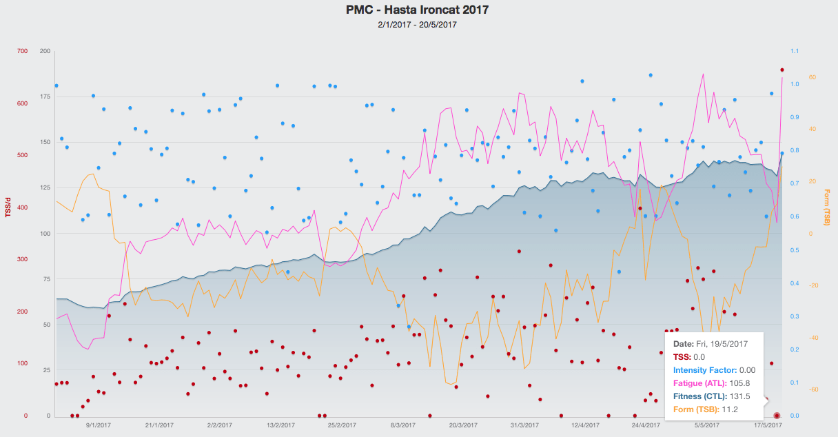 Como se puede ver en la gráfica «PMC», después de las 18 semanas de entrenamiento y 2 de tapering llegó en buenas condiciones para competir: con 131 CTL y 11 TSB.