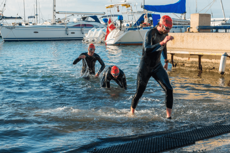 Natación: Con neopreno, a ritmo alegre y a pies (a ser posible). Sin ingesta durante el segmento.